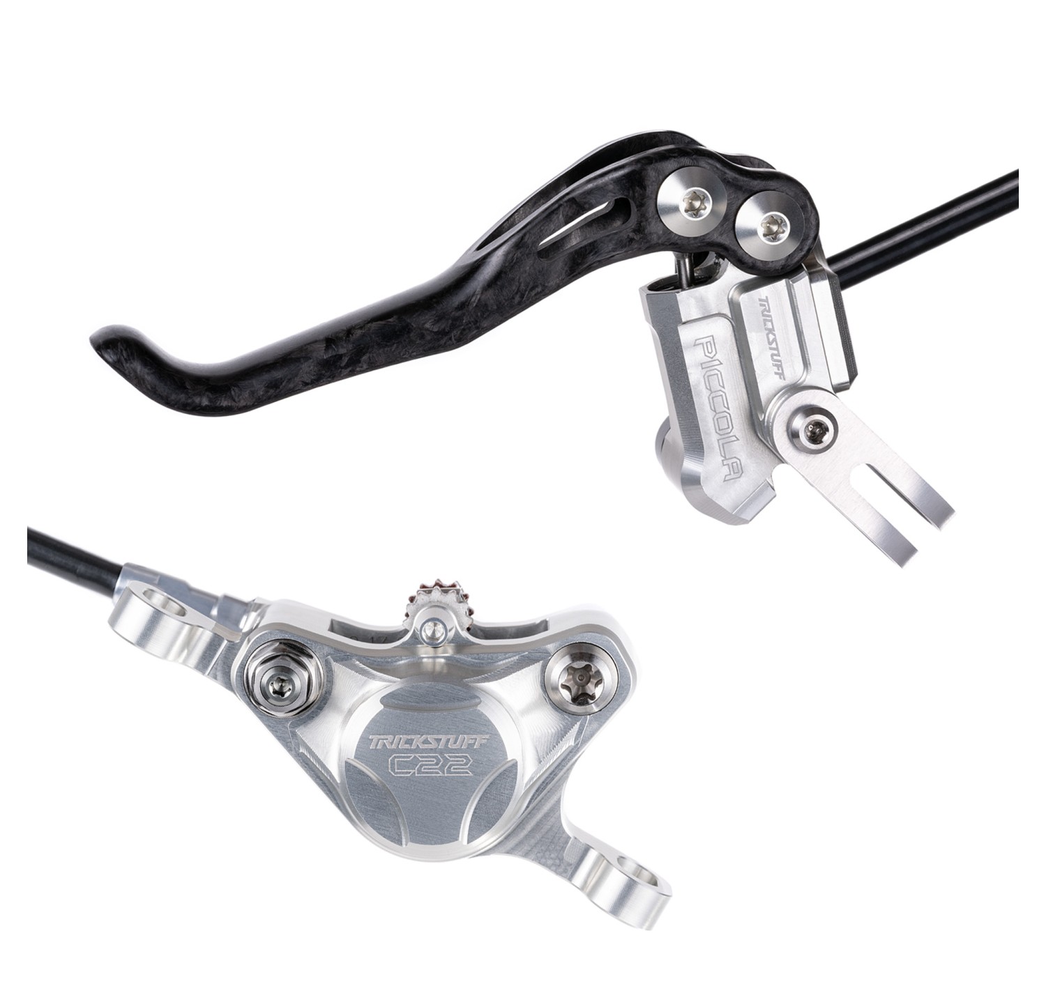 Le leve freno in carbonio e una pinza freno dal peso ottimizzato, fissata con bulloni in titanio, tirano fuori ogni grammo dalla Piccola Carbon, fino a soli 160 g. È quasi sfacciato implementare un rapporto tra un pistone della pompa da 9 mm e due pistoni in acciaio inossidabile da 22 mm in un alloggiamento della pompa così compatto e disposto radialmente, che stringe con una forza che fa sudare anche i pesi massimi. Un accumulo di forza frenante prevedibile e una modulazione precisa? Un gioco da ragazzi per la Piccola Carbon! Grazie alla trasmissione lineare della potenza, la forza delle dita viene trasmessa in modo uniforme, permettendoti di colpire i punti di frenata giusti anche quando la tua frequenza cardiaca raggiunge i 200. Con il suo peso piuma e la maneggevolezza intuitiva,