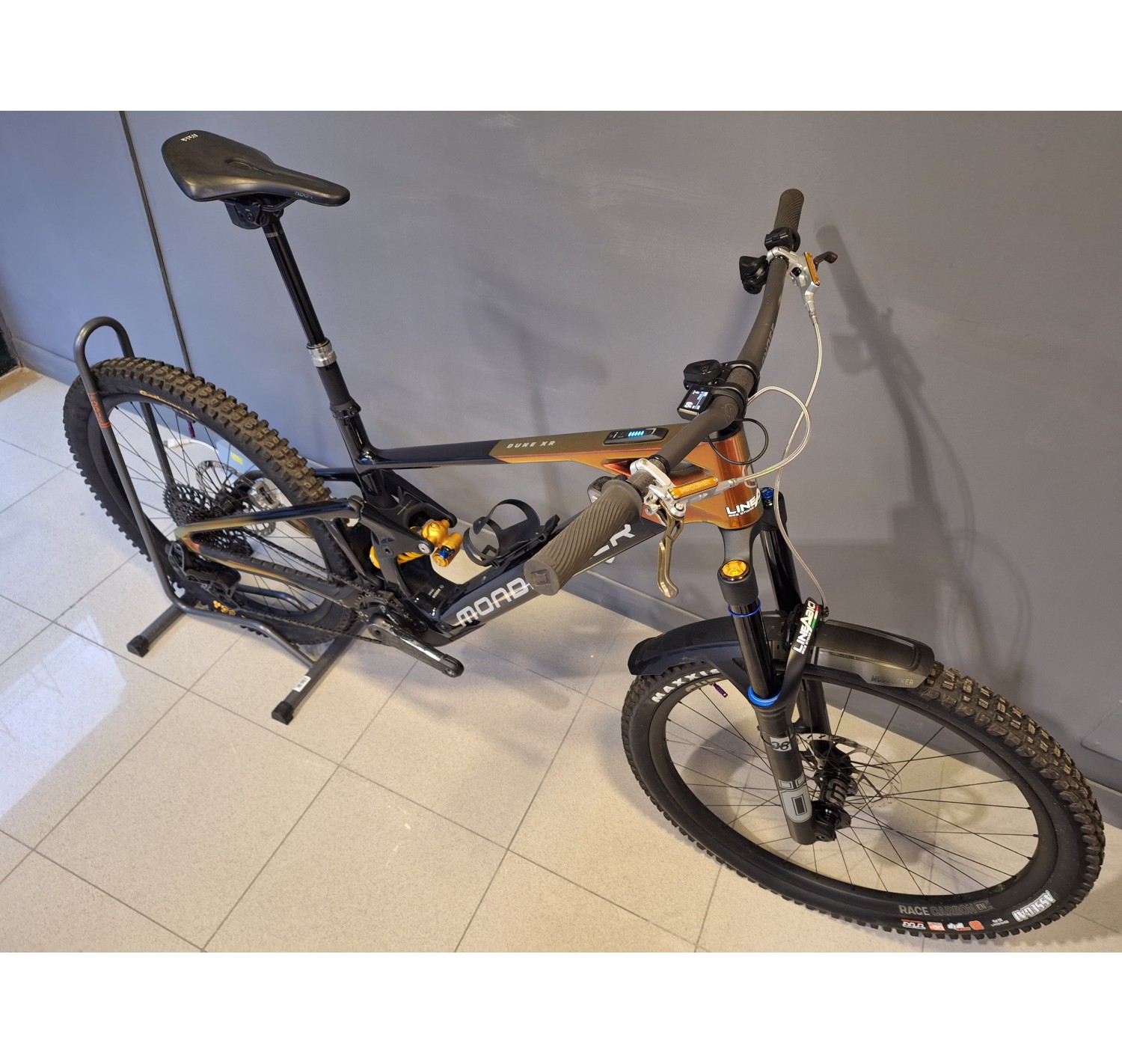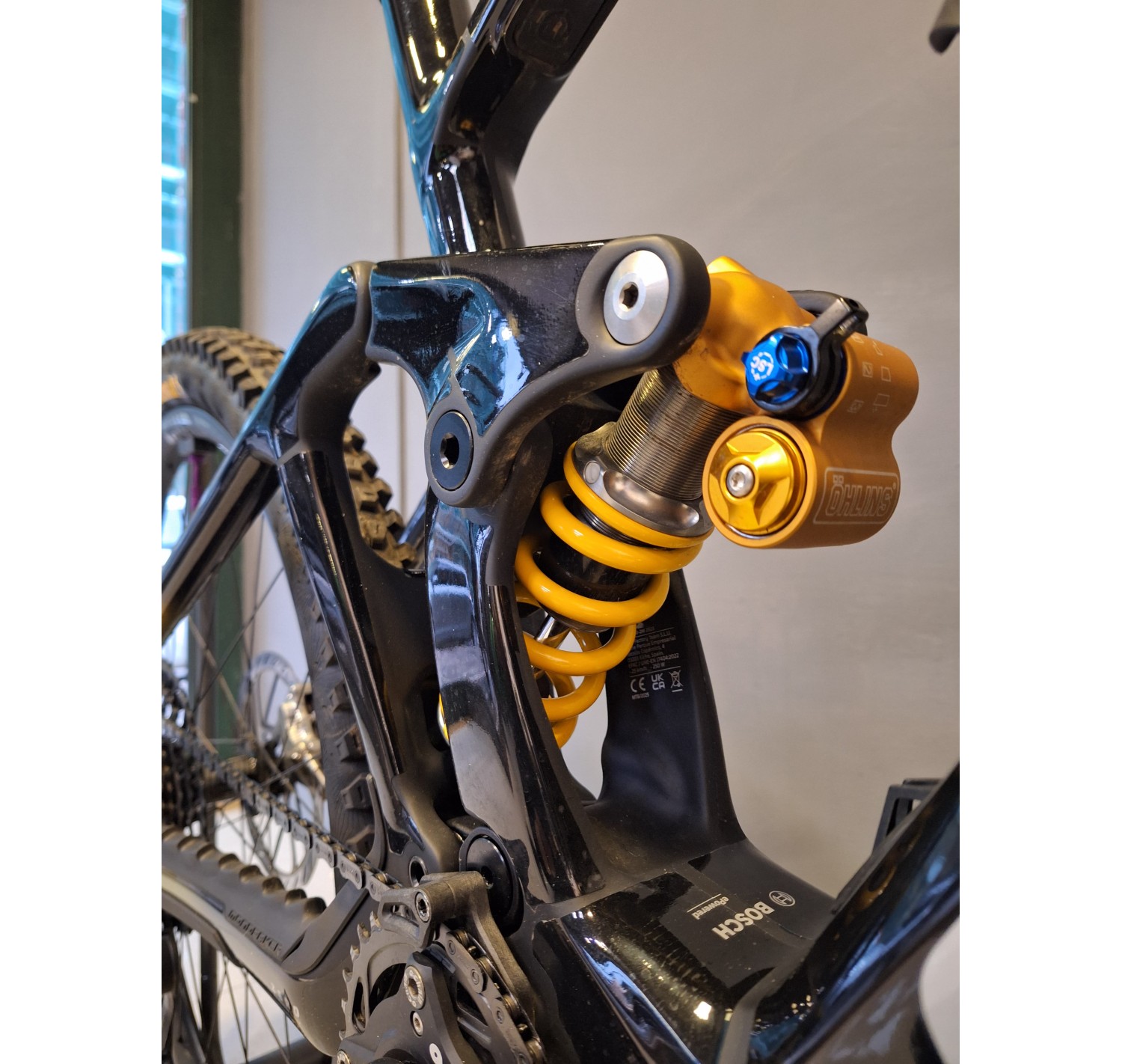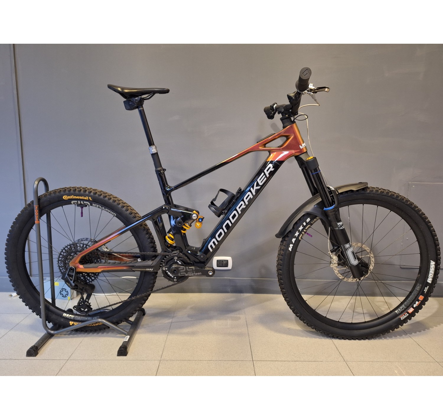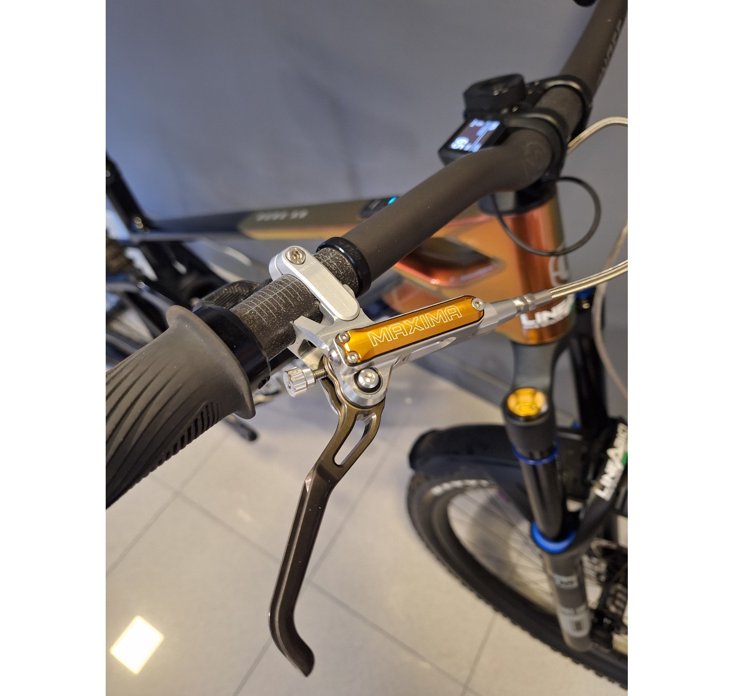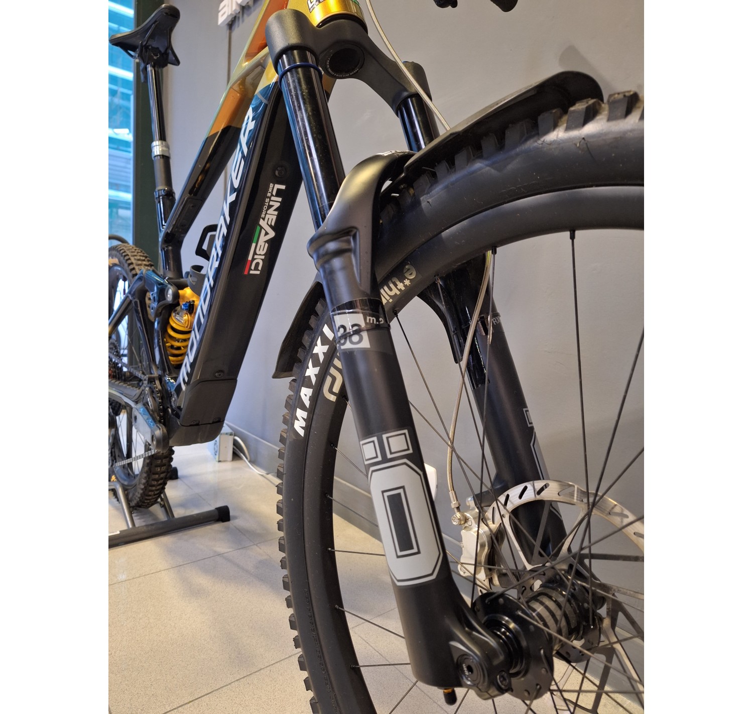 Forcella: Öhlins RXF 38 M.2 29, 180 mm, cartuccia TTX18 Twin Tube, tubo sterzo conico, asse Boost 15x110 mm, offset 44 mm. Impostazioni: leva compressione alta velocità con modalità salita, compressione basse velocità, ritorno, precarico aria, ramp chamber